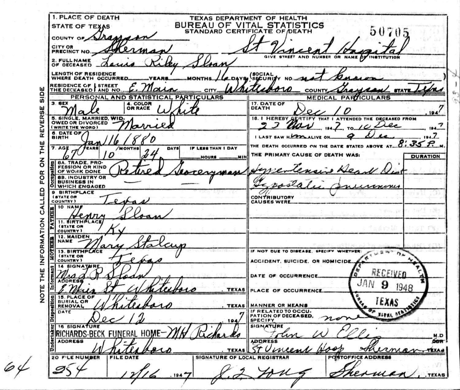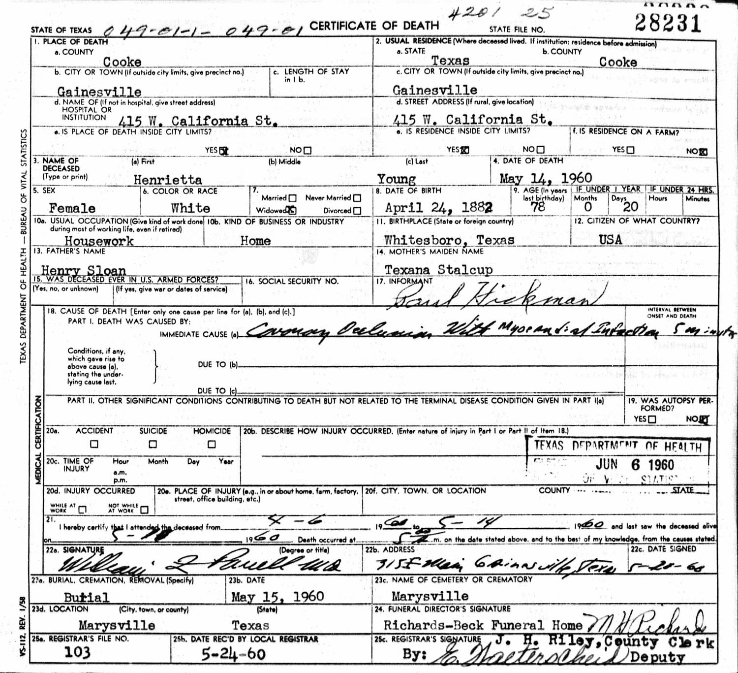 December 20, 1890 in Grayson Co., Texas