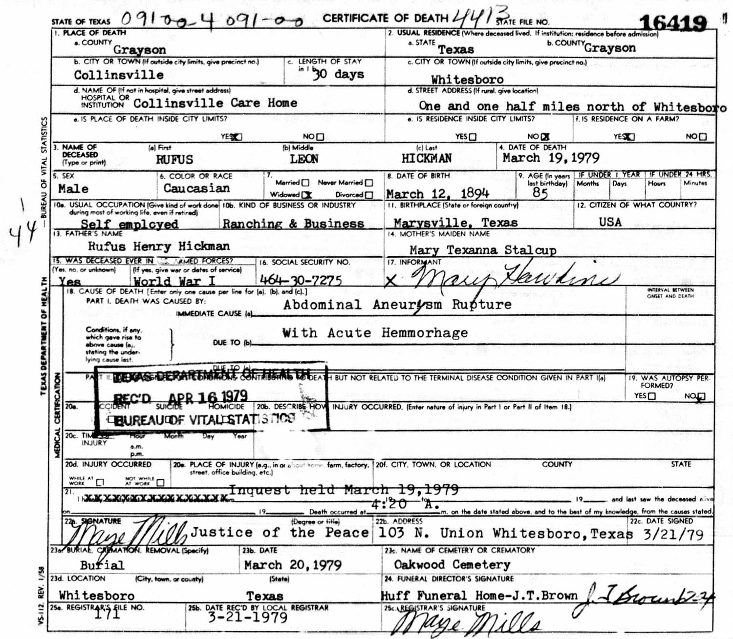 December 25, 1932 in Whitesboro, Texas; Oakwood Cemetery
