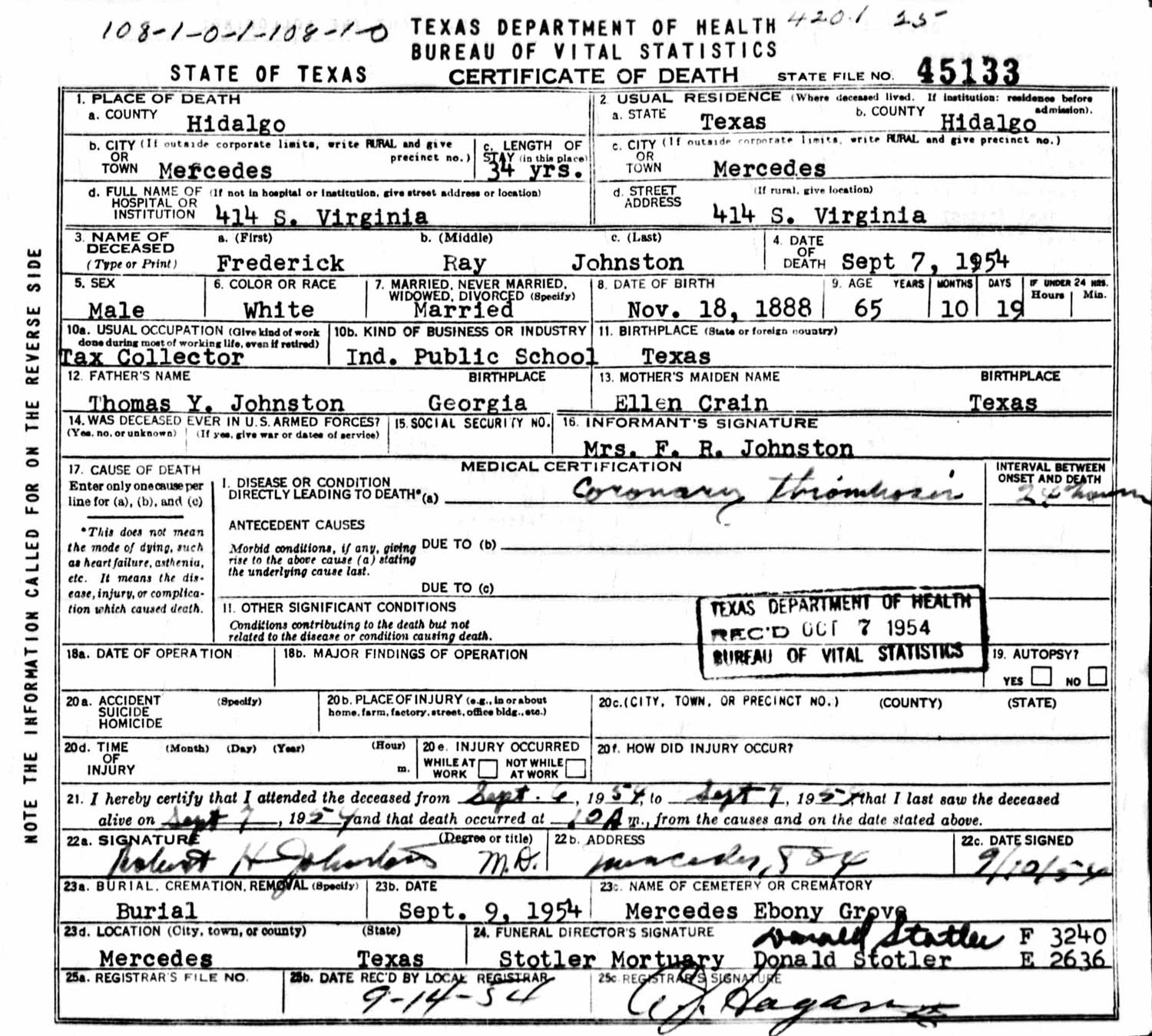 Sepember 1954 in Mercedes, Texas; 414 S. Virginia