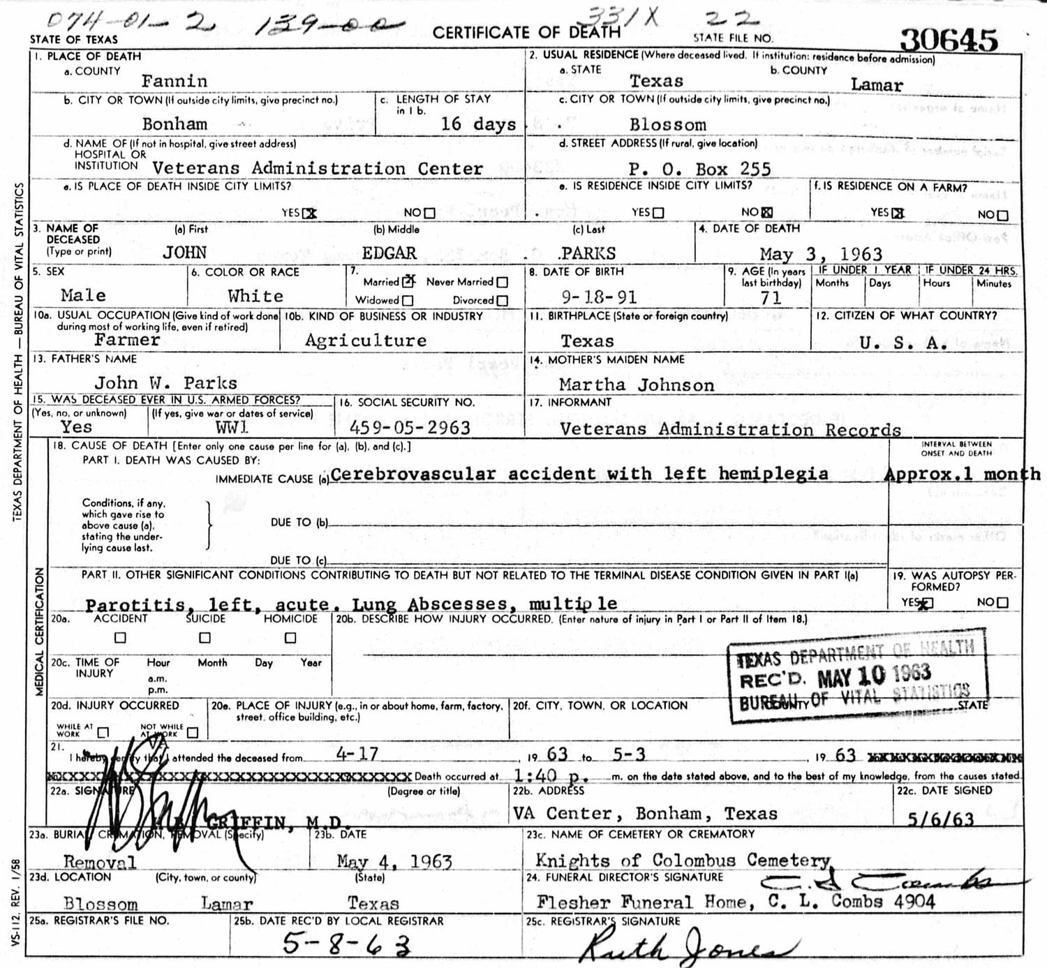 May 1963 in Blossom, Texas; P.O. Box 255