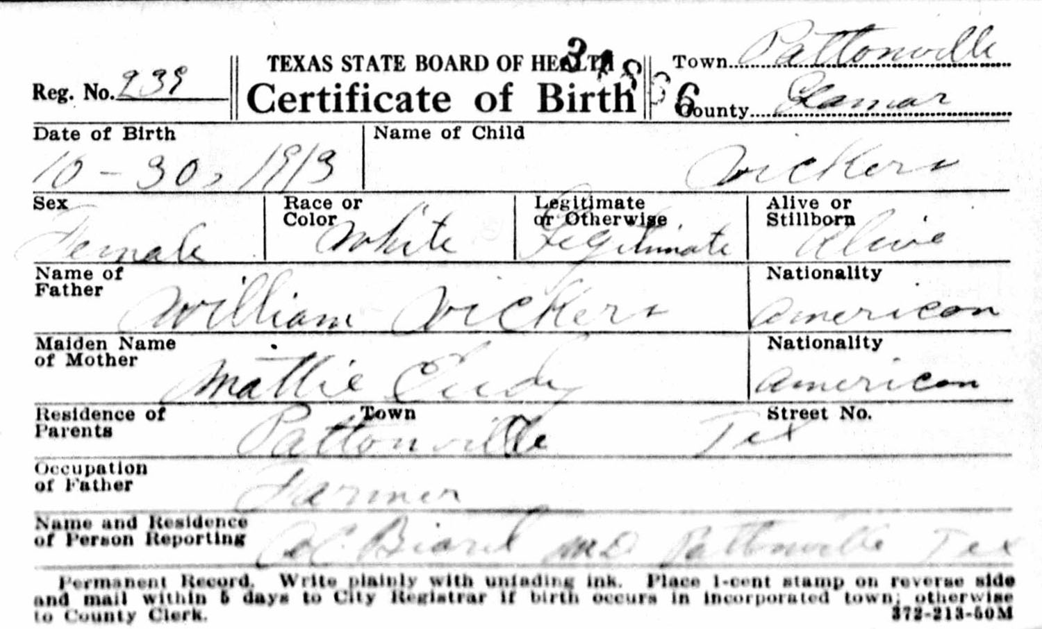 October 30, 1913 in Pattonville, Texas