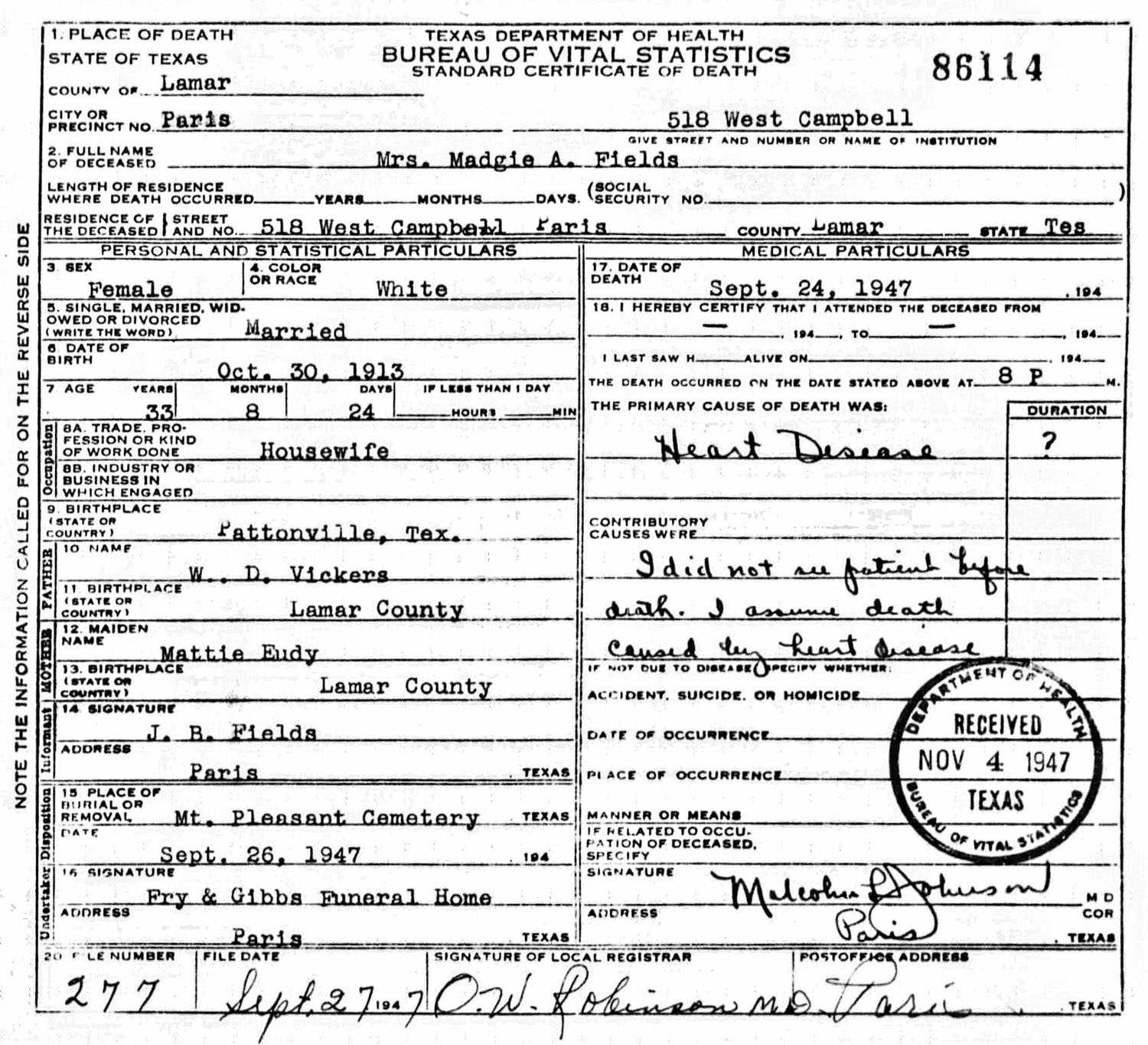 September 24, 1947 in Paris, Texas; 518 West Cambell