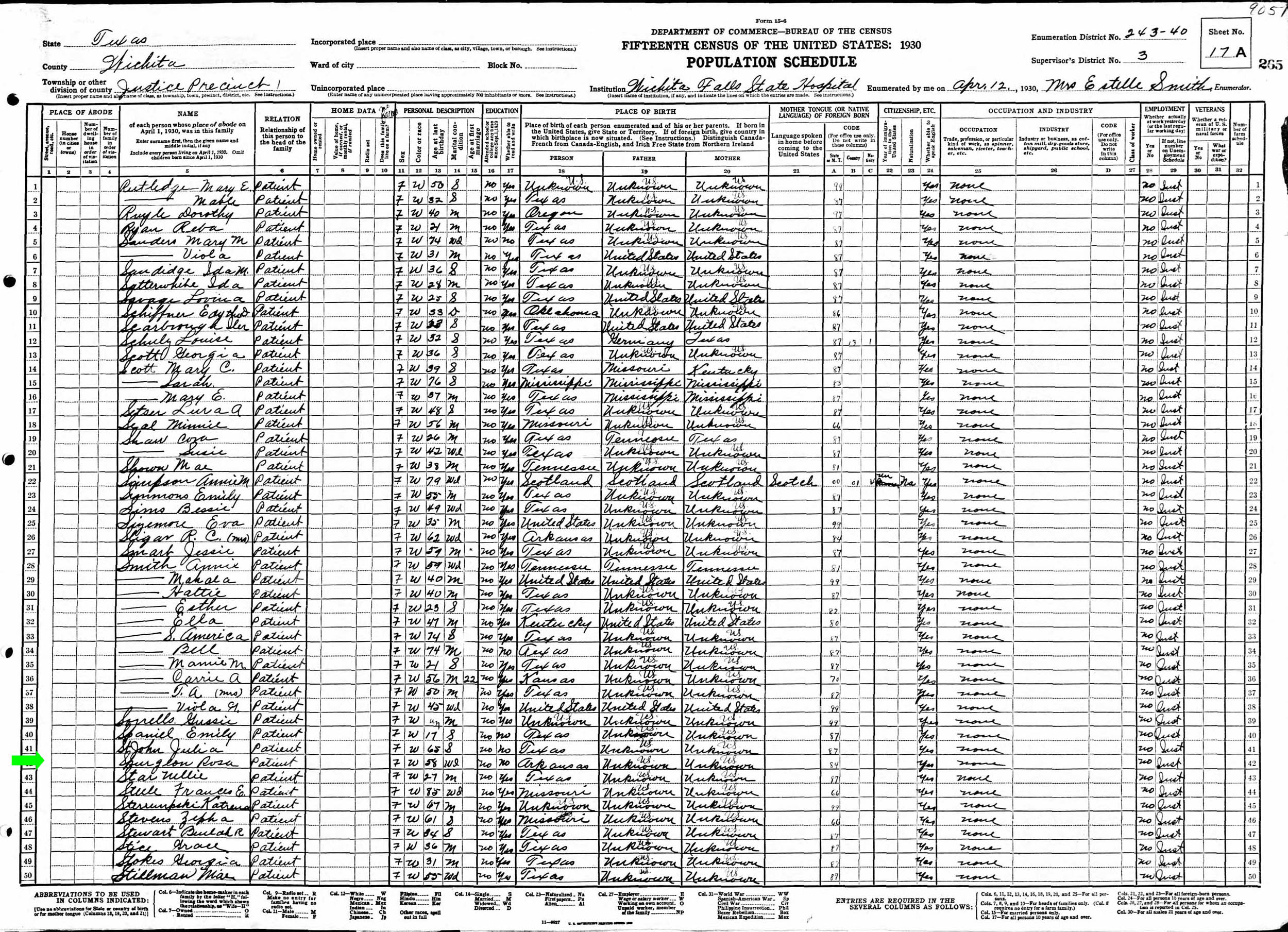 April 1930 in Wichita Co., Texas; Wichita Falls State Hospital (Mental Hospital)