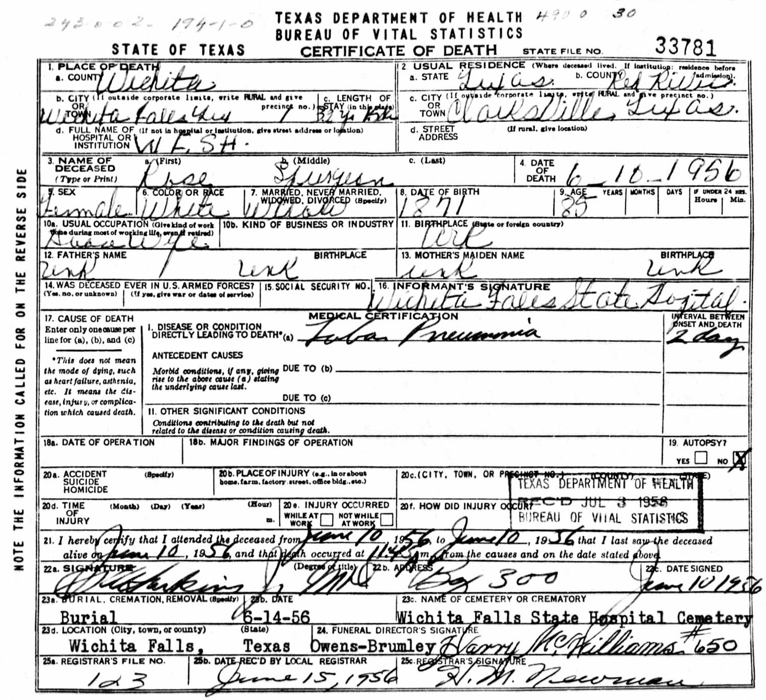 June 14, 1956 in Wichita Falls, Texas; North Texas State Hospital Cemetery