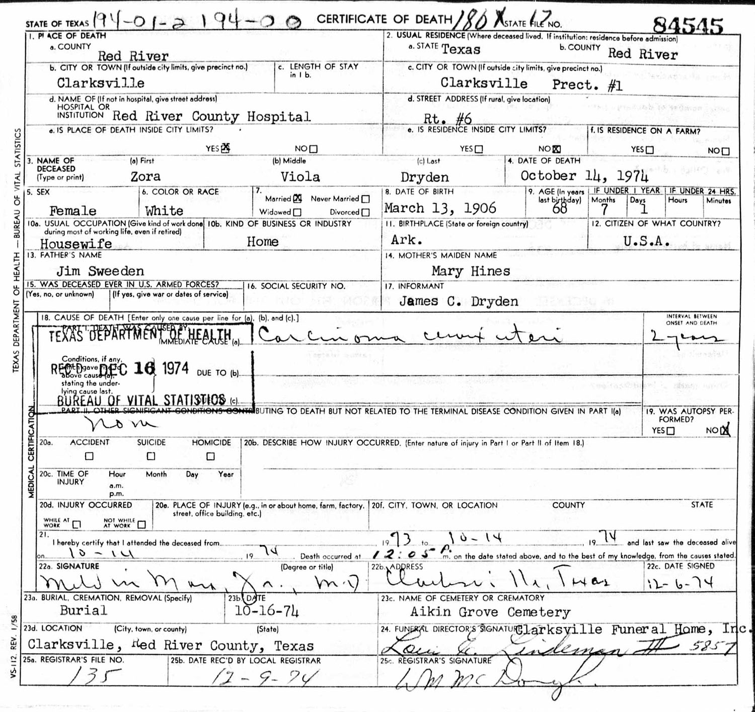 September 20, 1978 in Clarksville, Texas; Aikin Grove Cemetery