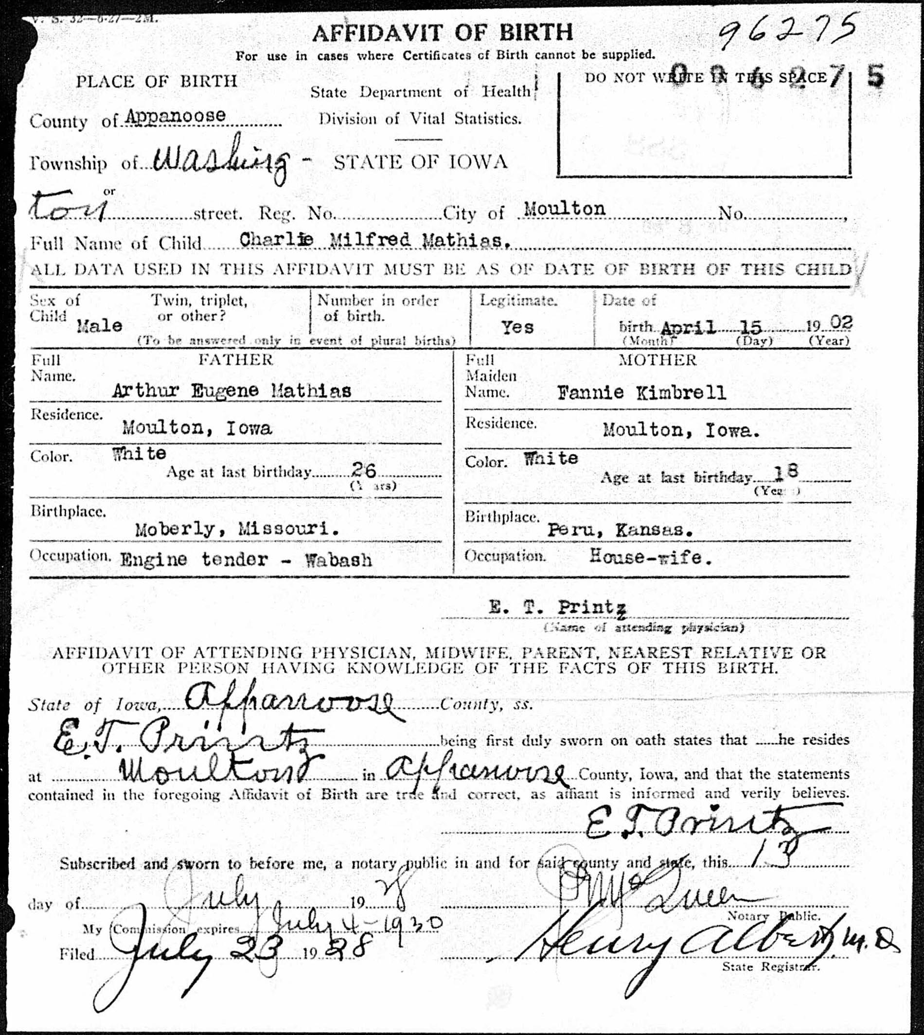 July 28, 1901 in Moulton, Iowa