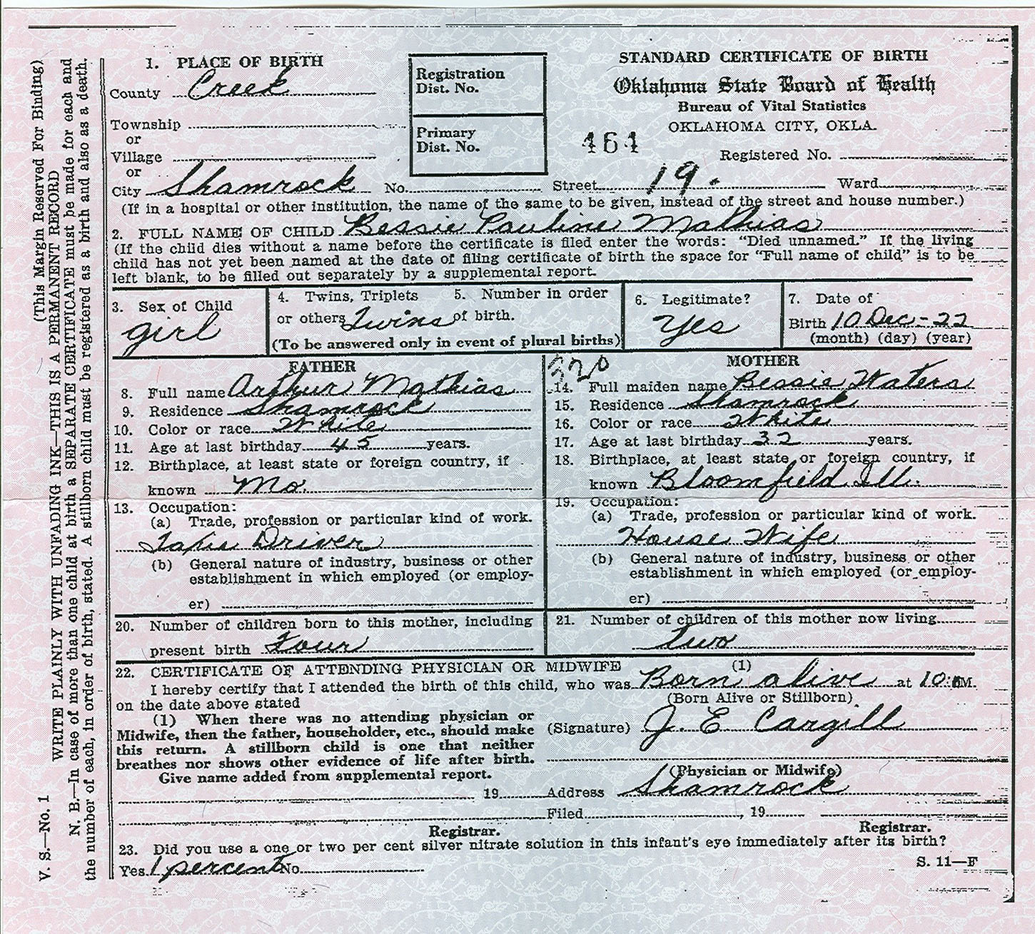 Married: March 09, 1922 in Chandler, Oklahoma; Courthouse