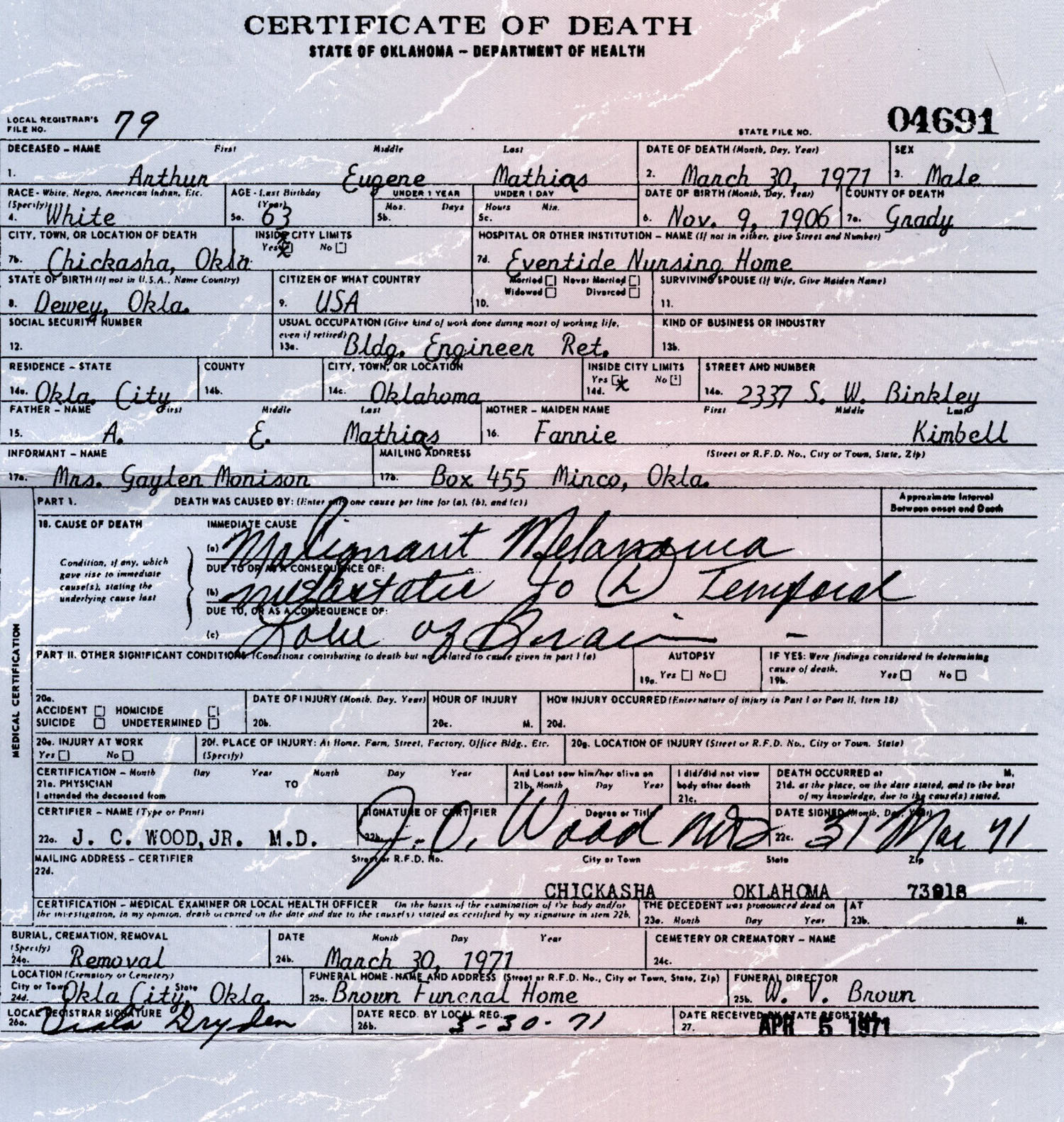 August 16, 1928 in Oklahoma City, Oklahoma; Fairlawn Cemetery - Section 4, Row 12, Grave 9 (up against the fence)