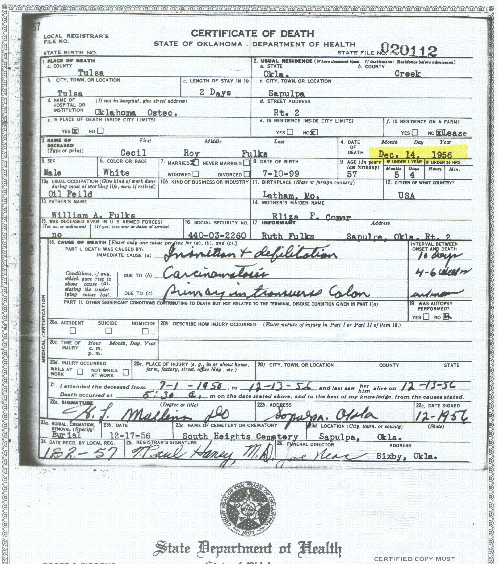 December 17, 1956 in Sapulpa, Oklahoma; South Heights Cemetery