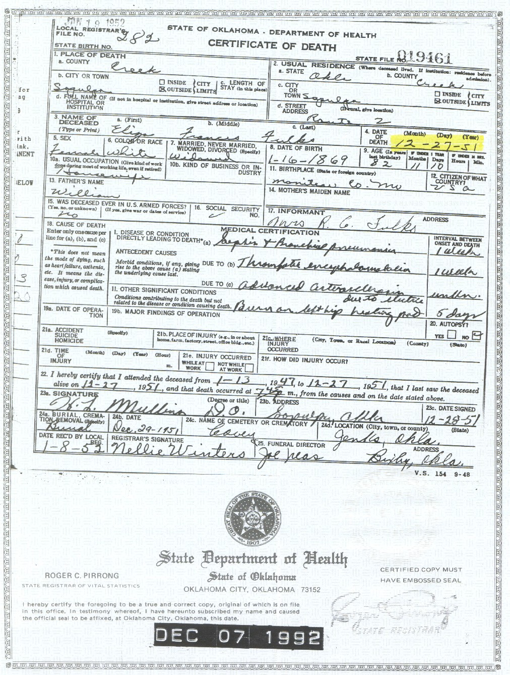 December 27, 1951 in Glenpool, Oklahoma; At home - 2 miles west of town