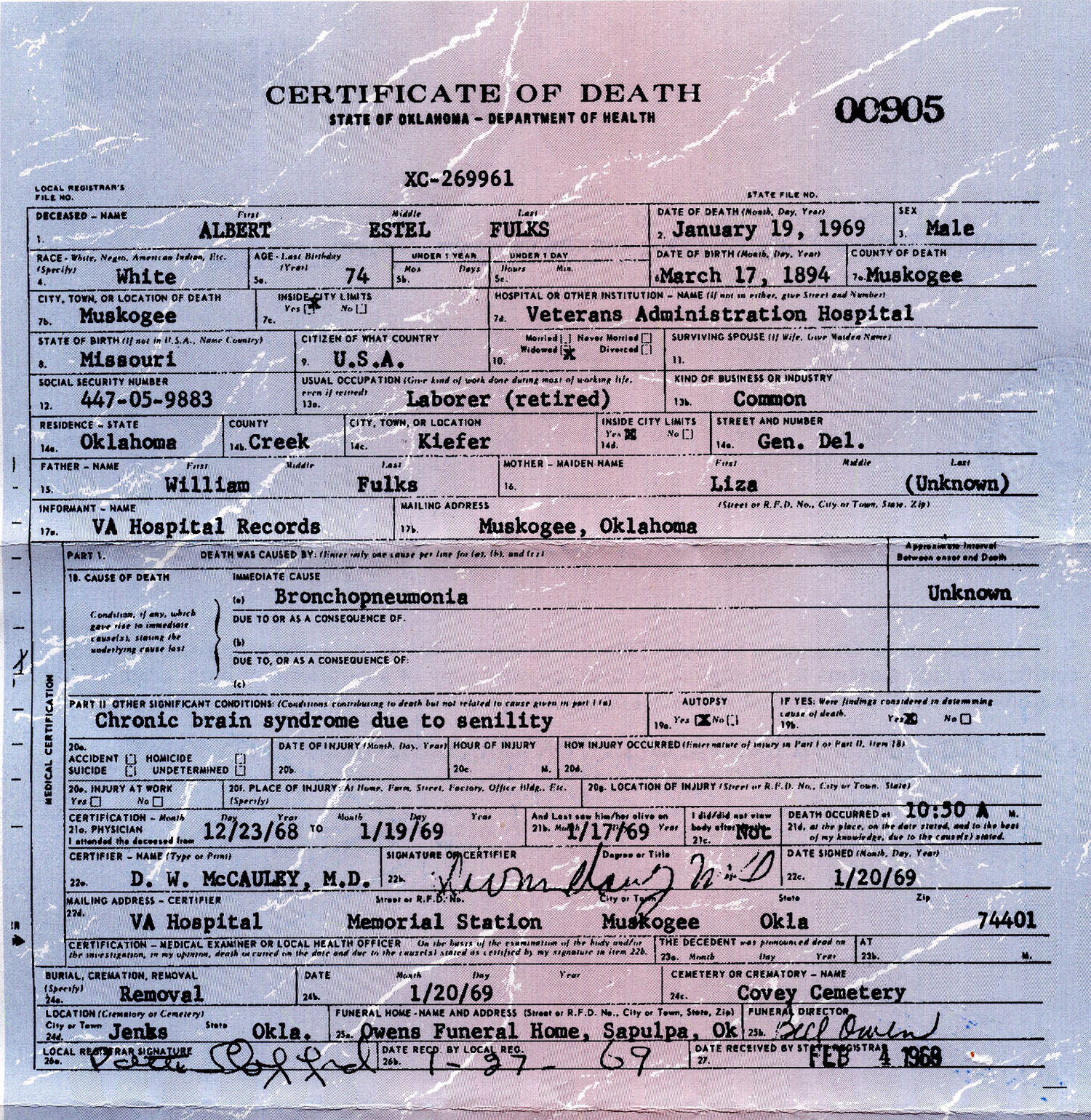 December 29, 1951 in Jenks, Oklahoma; Rosencutter (Covey) Cemetery
