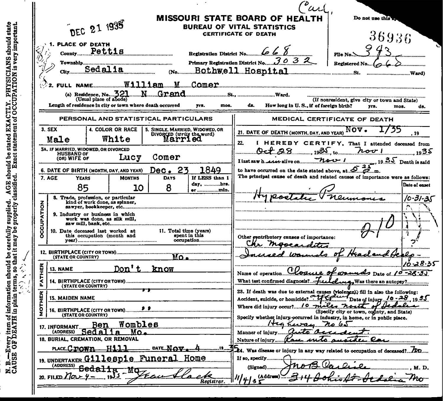 November 04, 1935 in Sedalia, Missouri; Crown Hill Cemetery