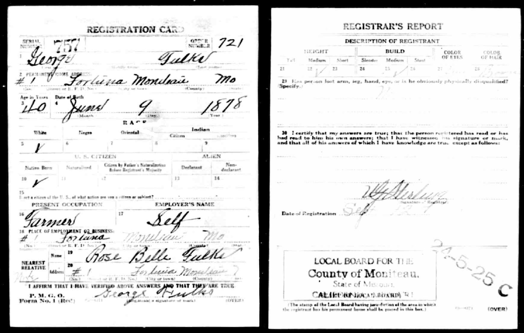 Sepember 1918 in Fortuna, Missouri; Farmer