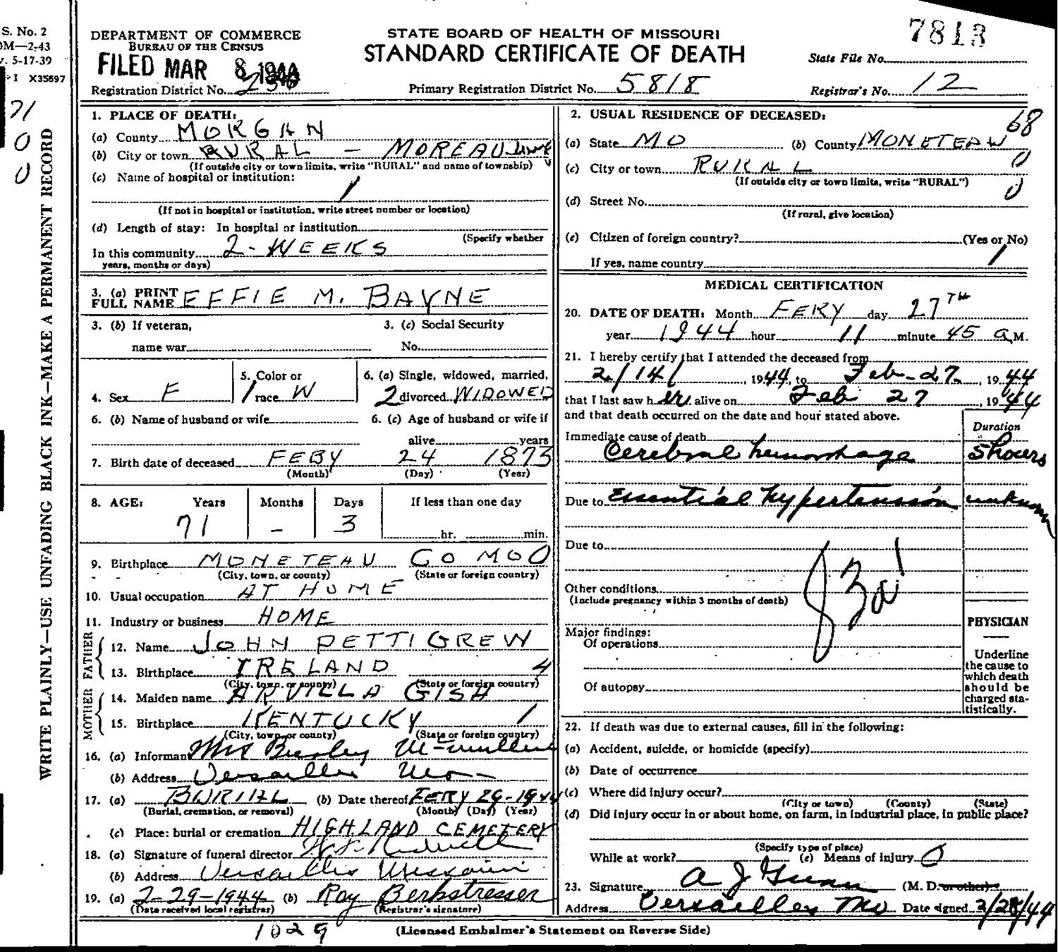 February 29, 1944 in Moniteau Co., Missouri; Highland Cemetery