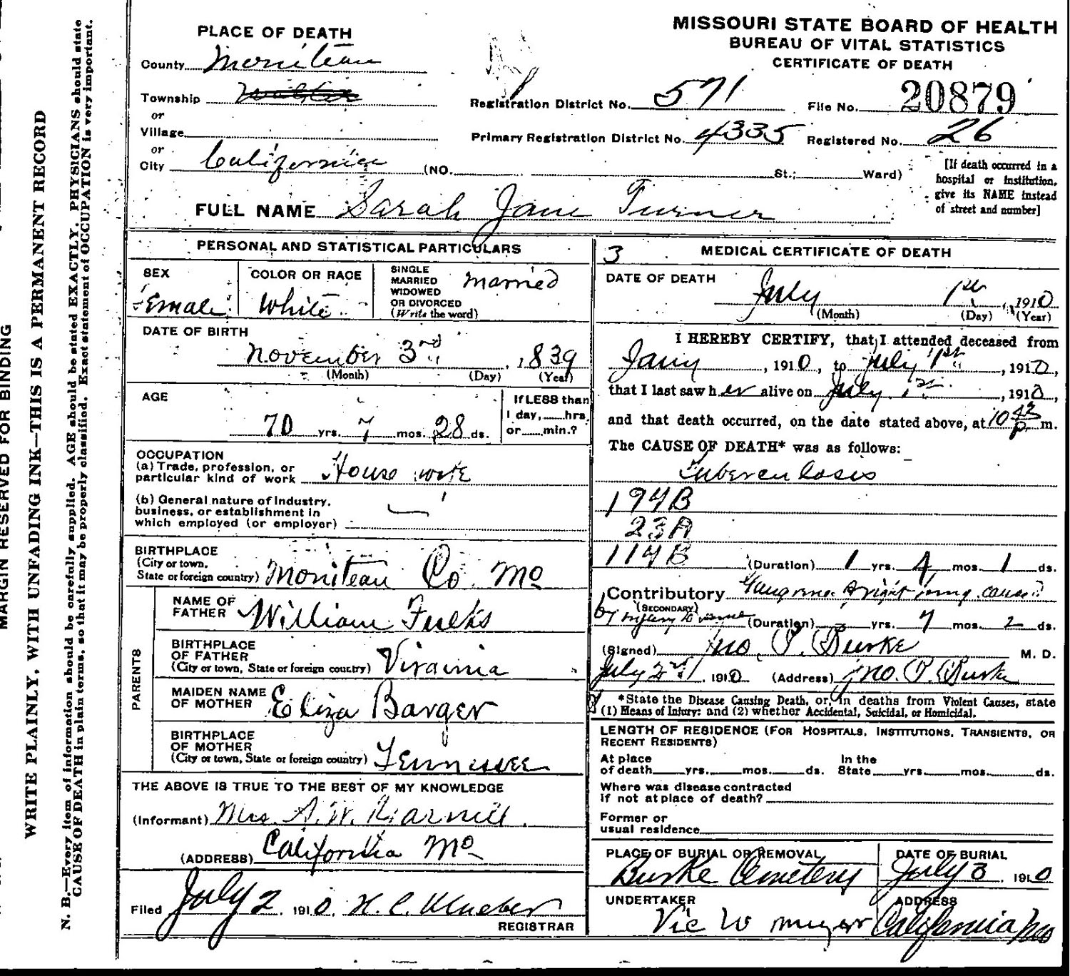 Sarah Jane Fulks (1839 - 1910)