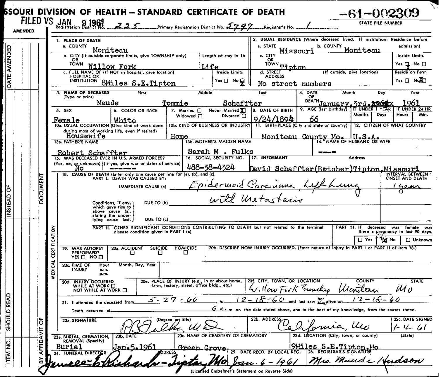 February 24, 1889 in Latham, Missouri; Old Highland Christian Church (2.5 miles southwest of town)