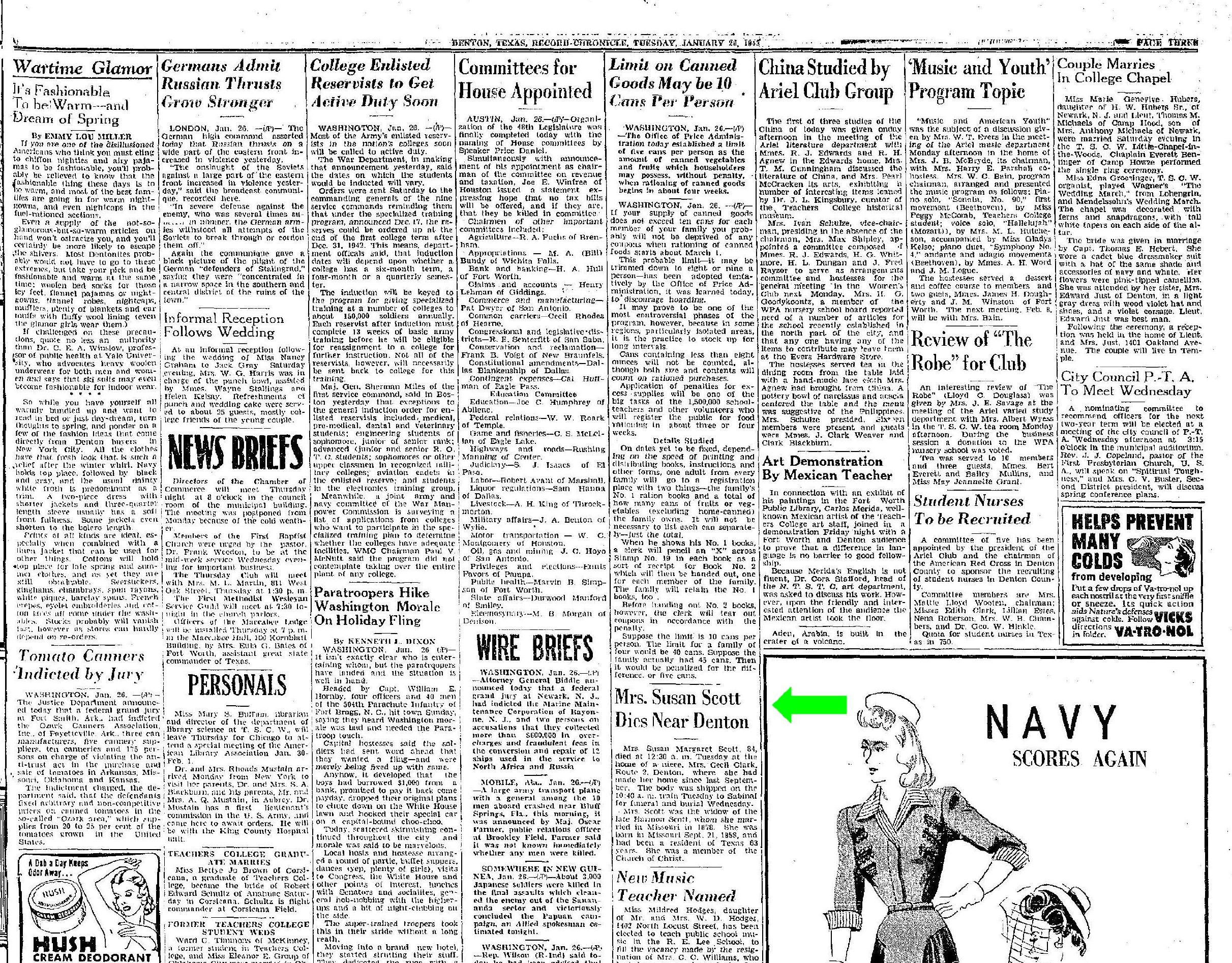January 26, 1943 in Denton, Texas; At the home of her niece, Mrs. Cecil Clark