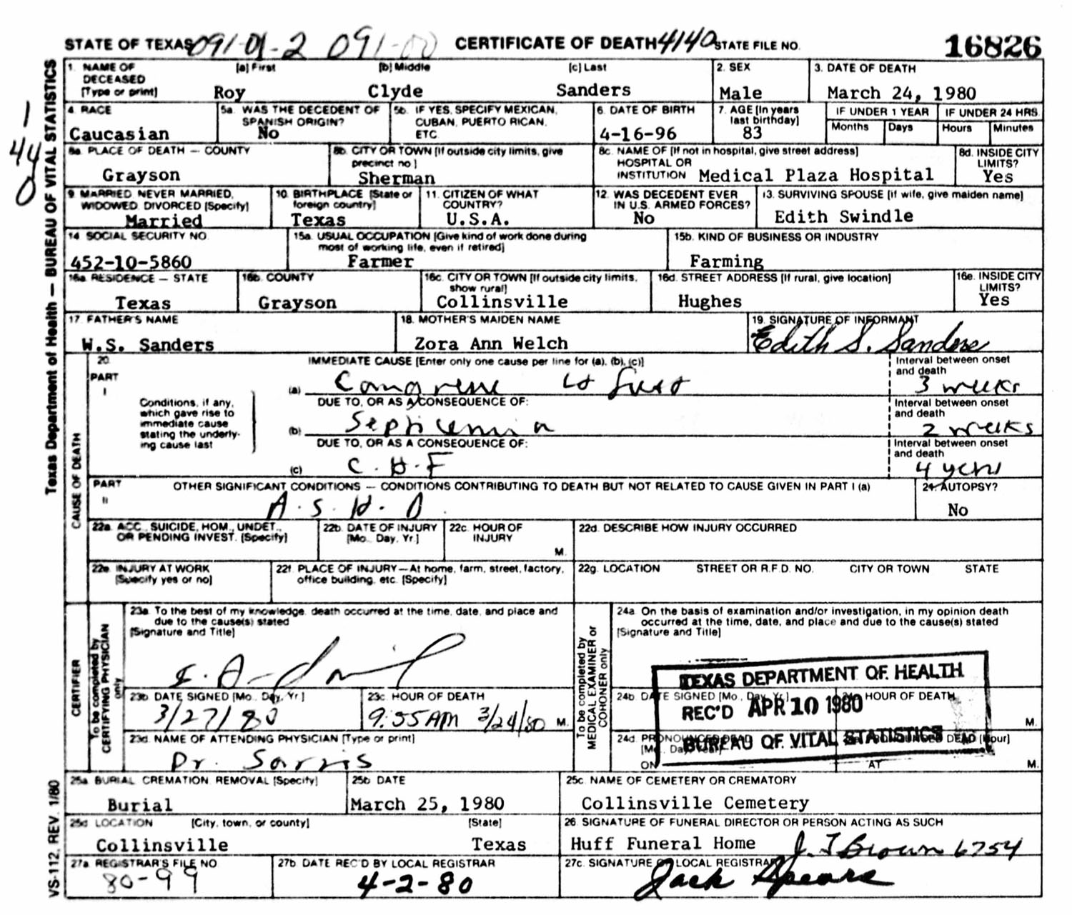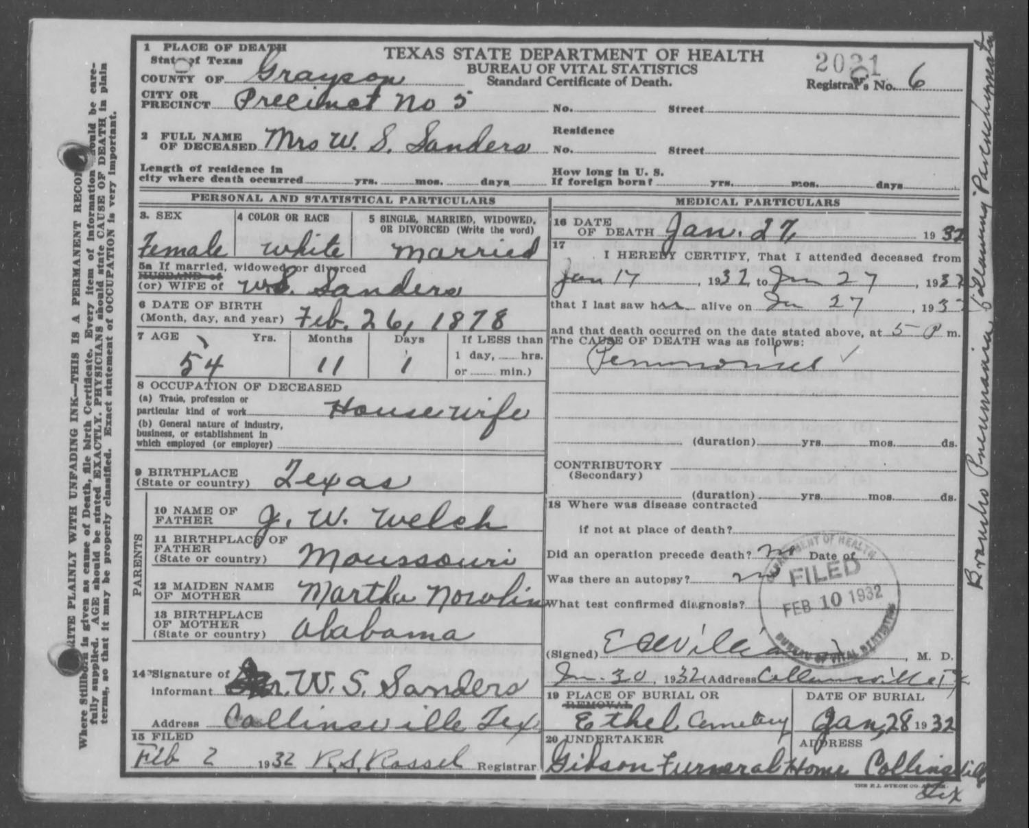 Between 1912 and 1914 in Collinsville, Texas; lived on a farm