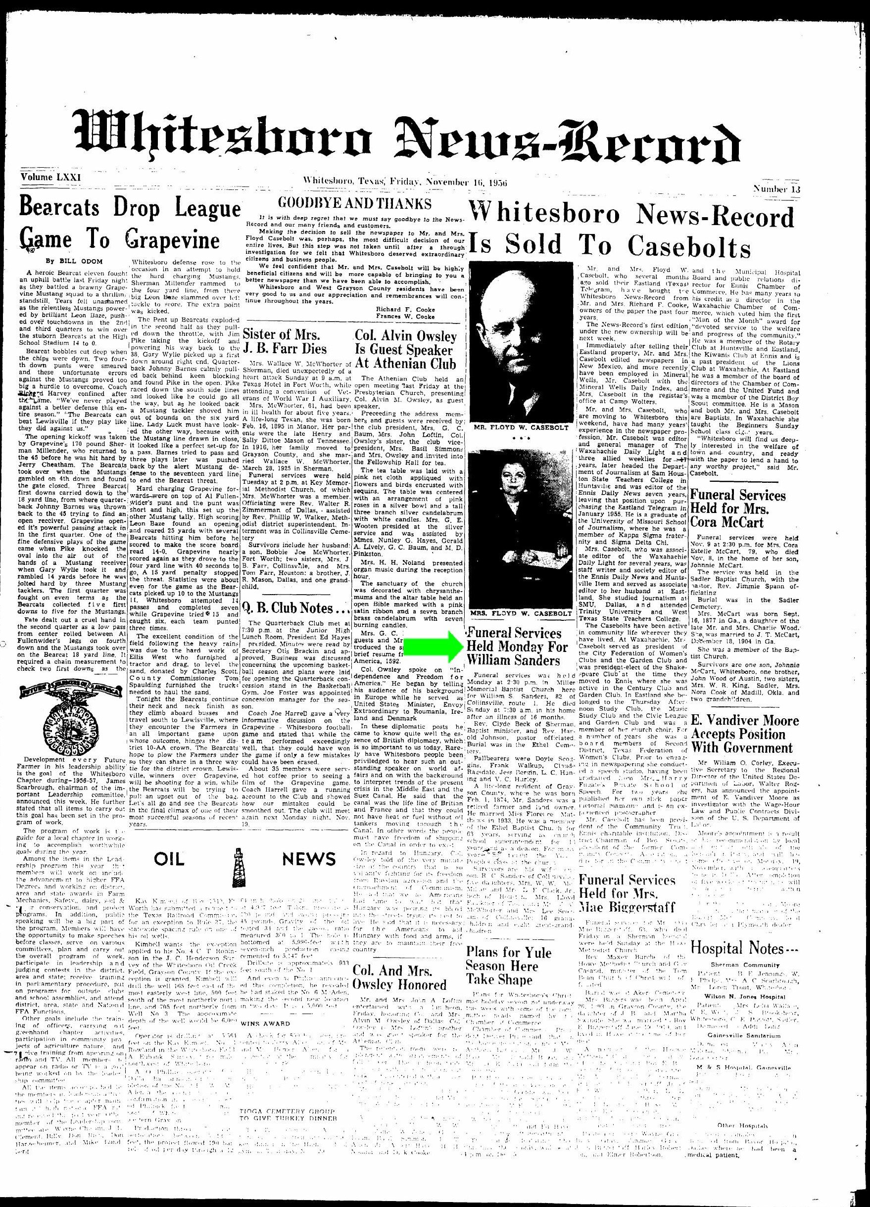 November 12, 1956 in Whitesboro, Texas; Miller Memorial Baptist Church - Waldo Funeral Home