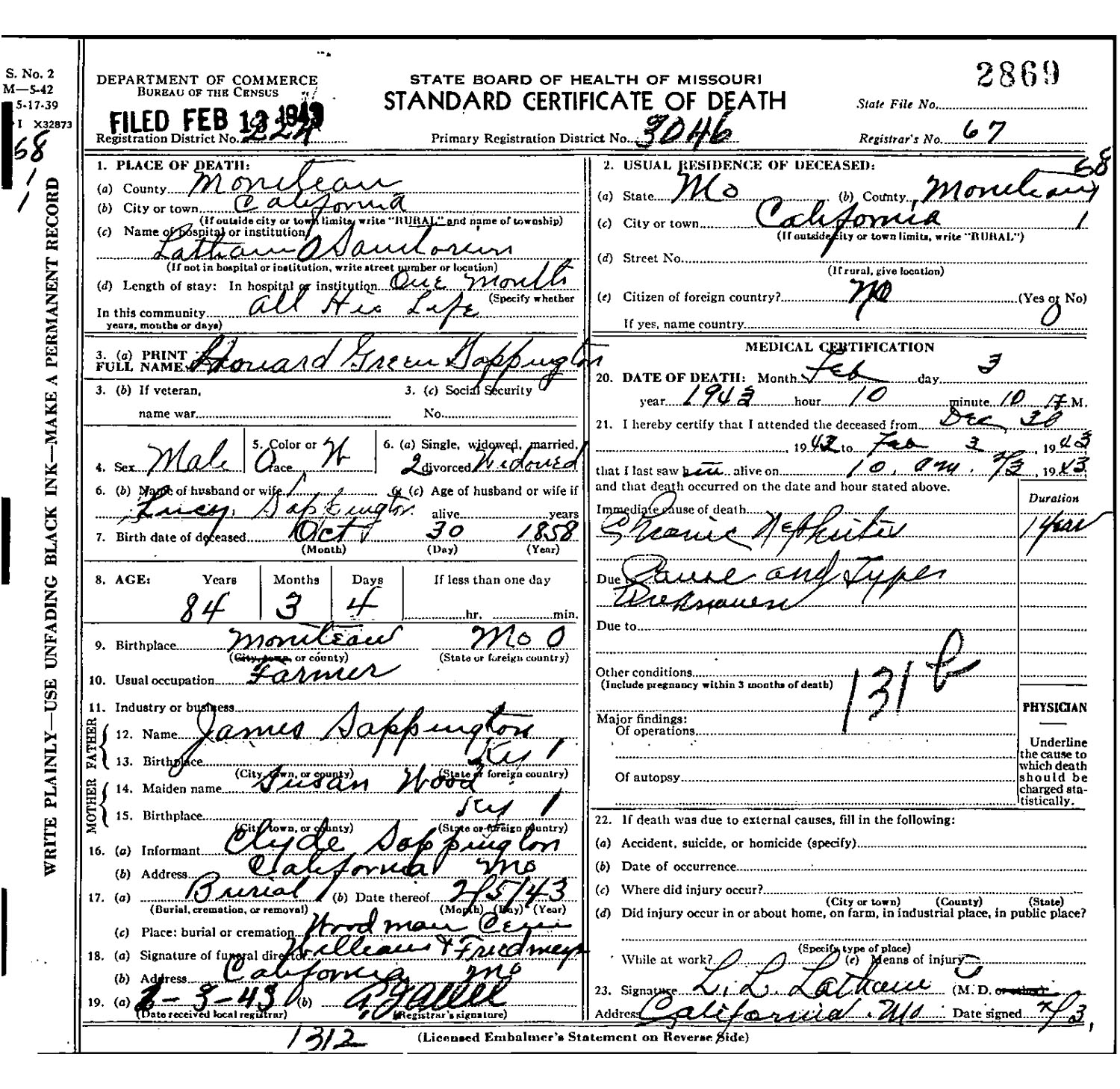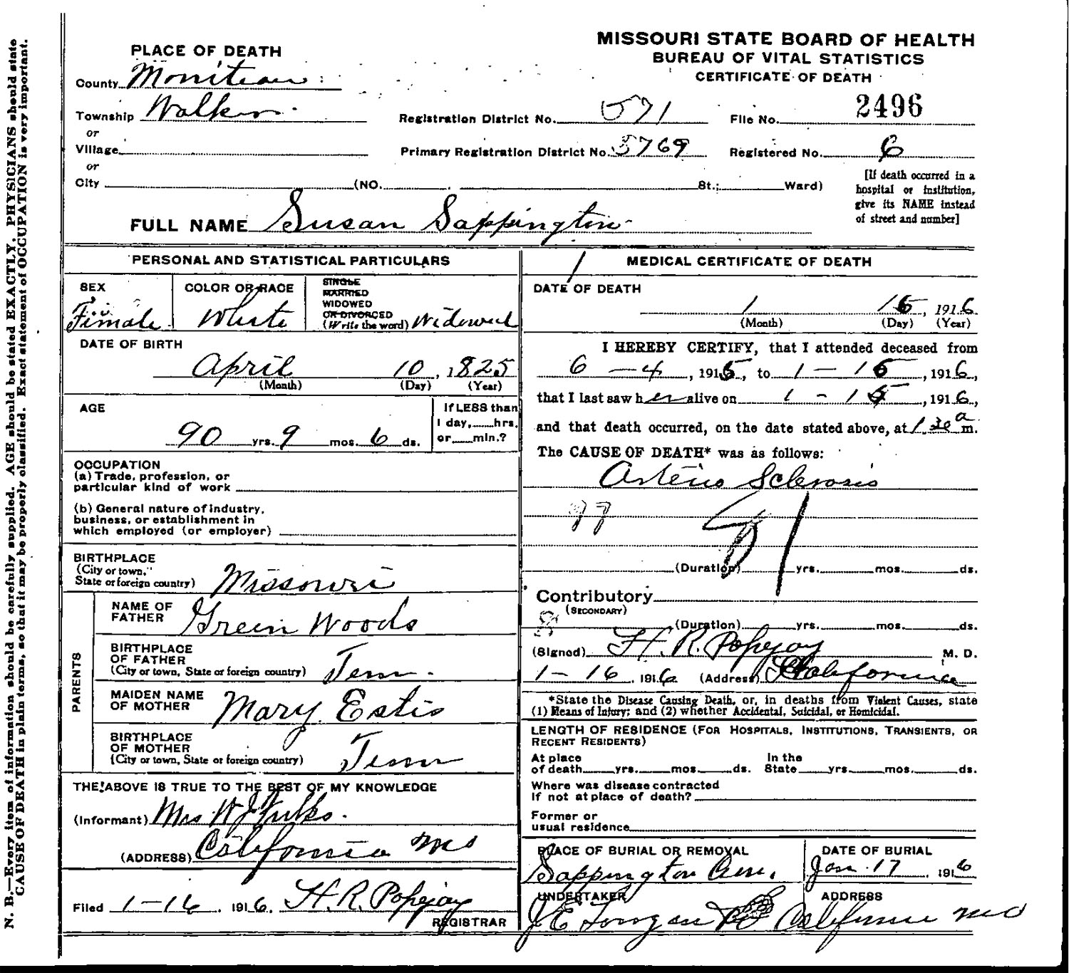 January 17, 1916 in California, Missouri; Sappington Community Chapel Cemetery
