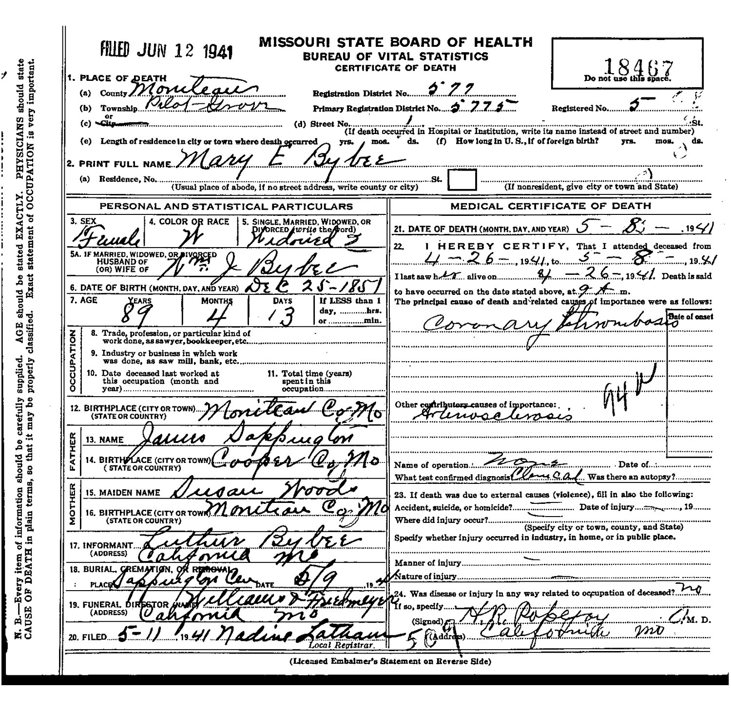 June 1860 in Moniteau Co., Missouri