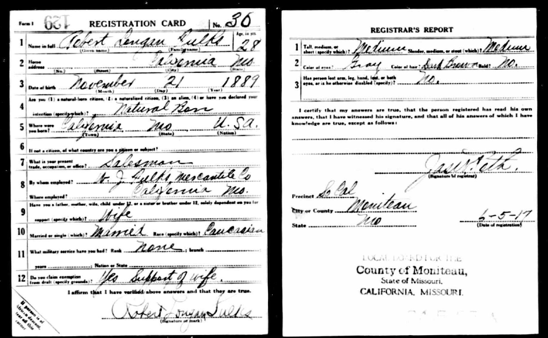 June 1917 in California, Missouri; Saleman - W. J. Fulks Mercantile Co.