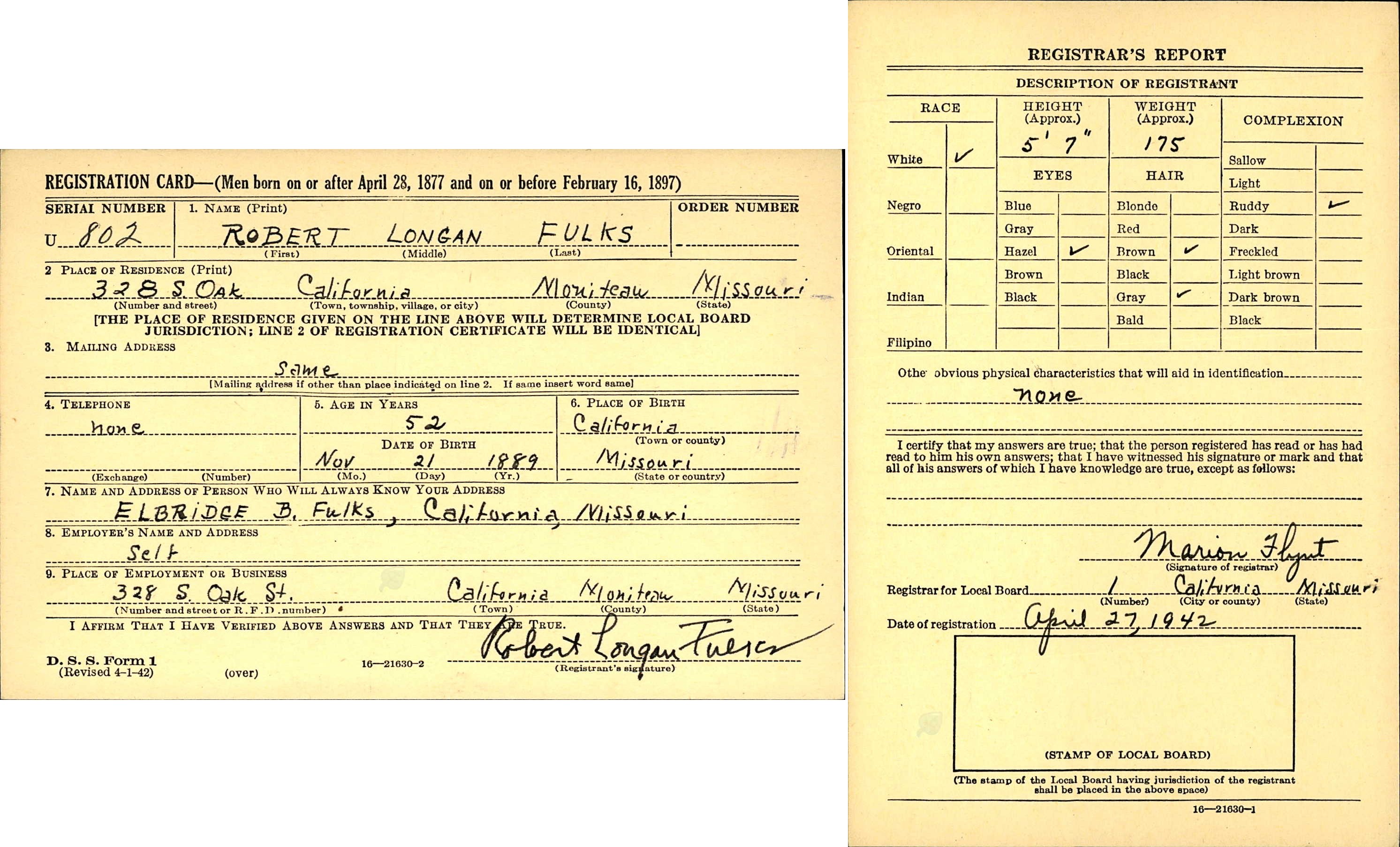 April 1942 in California, Missouri; Self Employeed