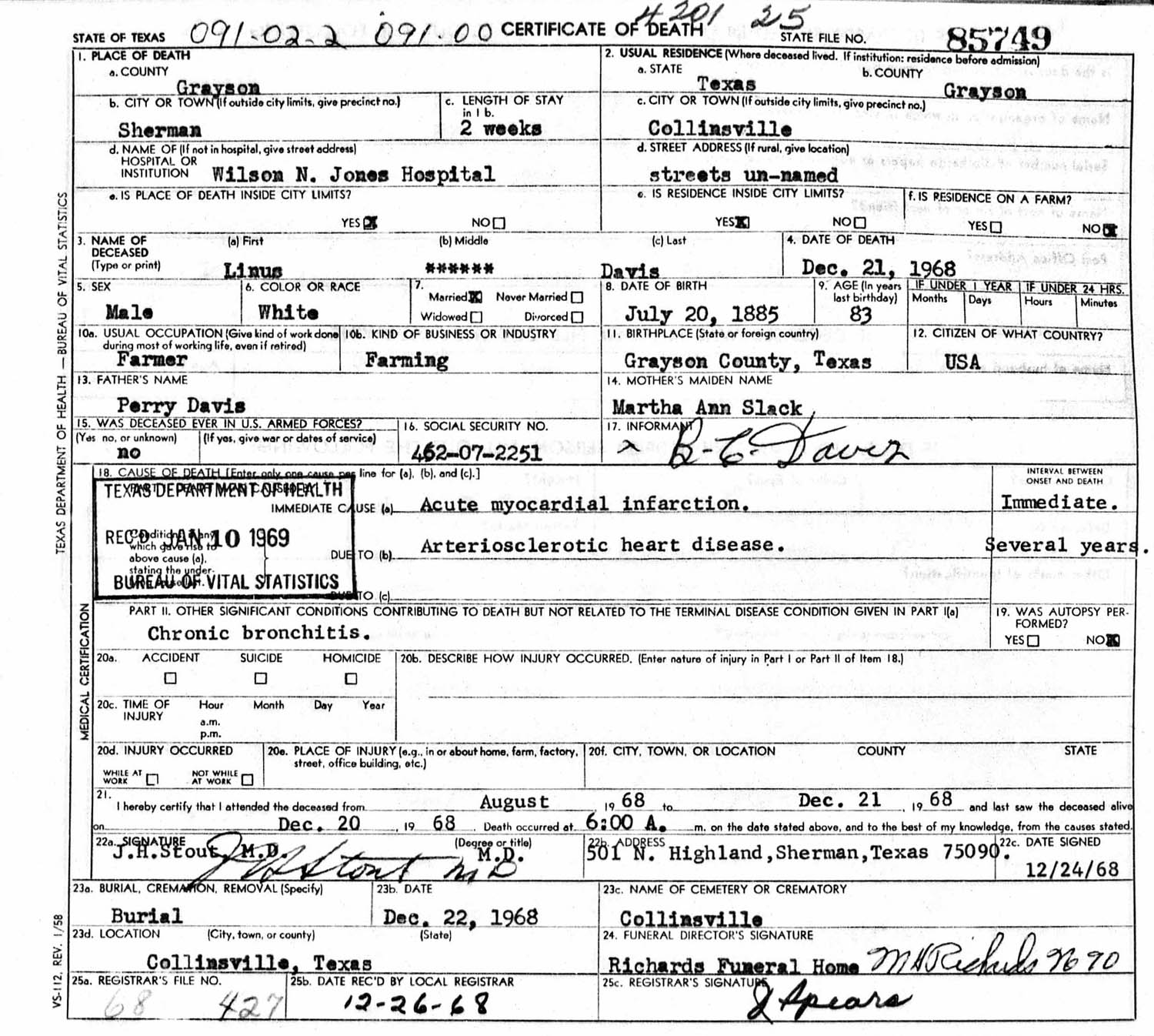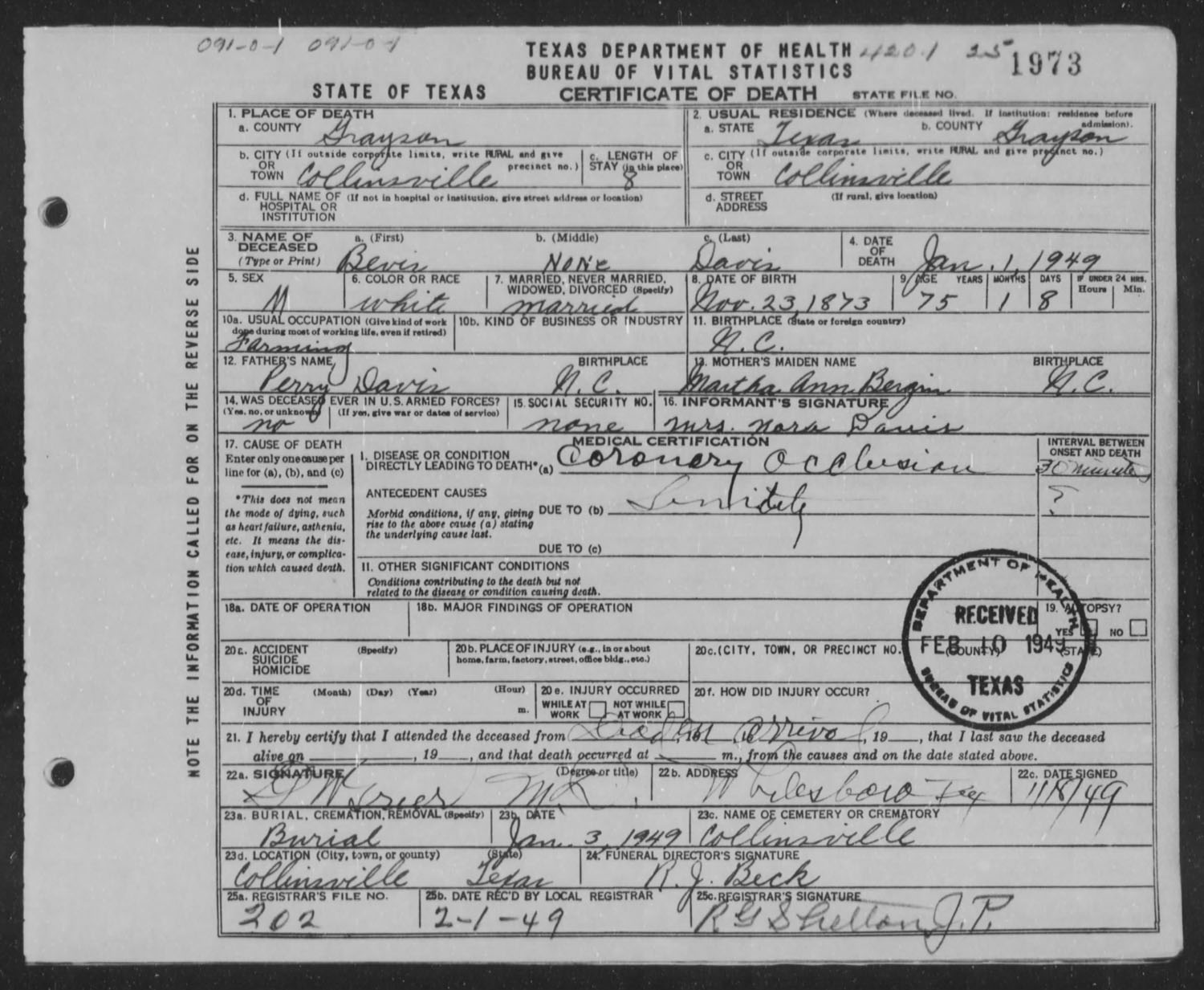 March 31, 1943 in Collinsville, Texas; Collinsville Methodist Church - Talley Funeral Home